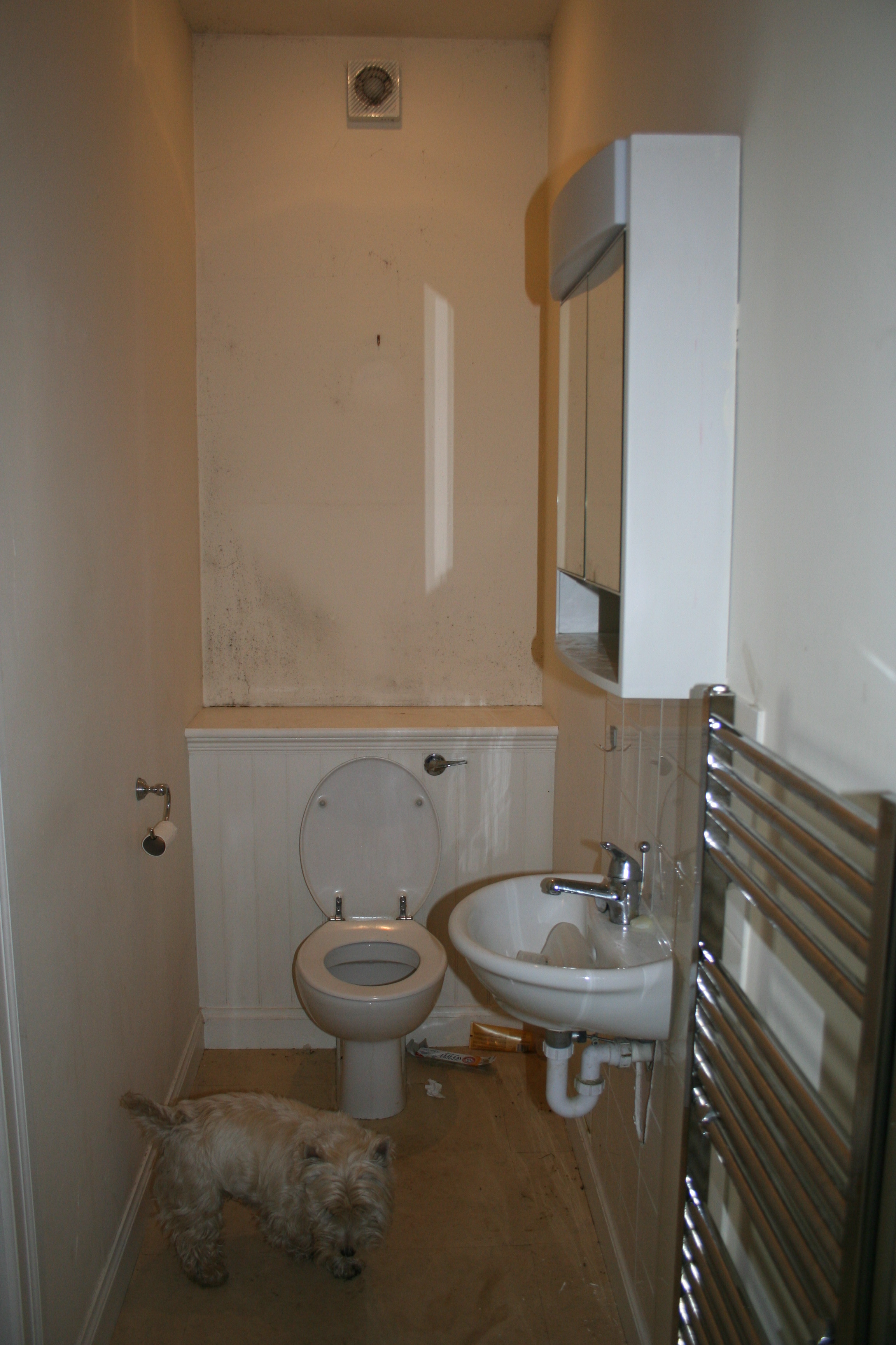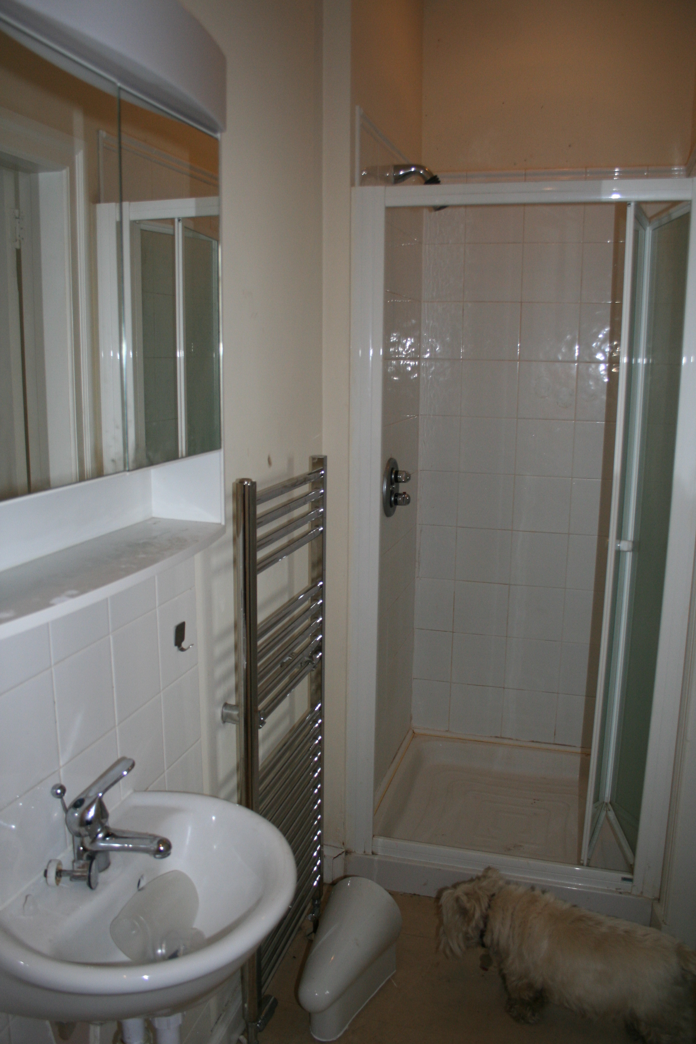 The en suite shower room is on its way out. These are the before, we’ll get the after tomorrow when the wall is removed that adjoins the bathroom that was. The last picture shows the old bathroom, you can hardly get in.