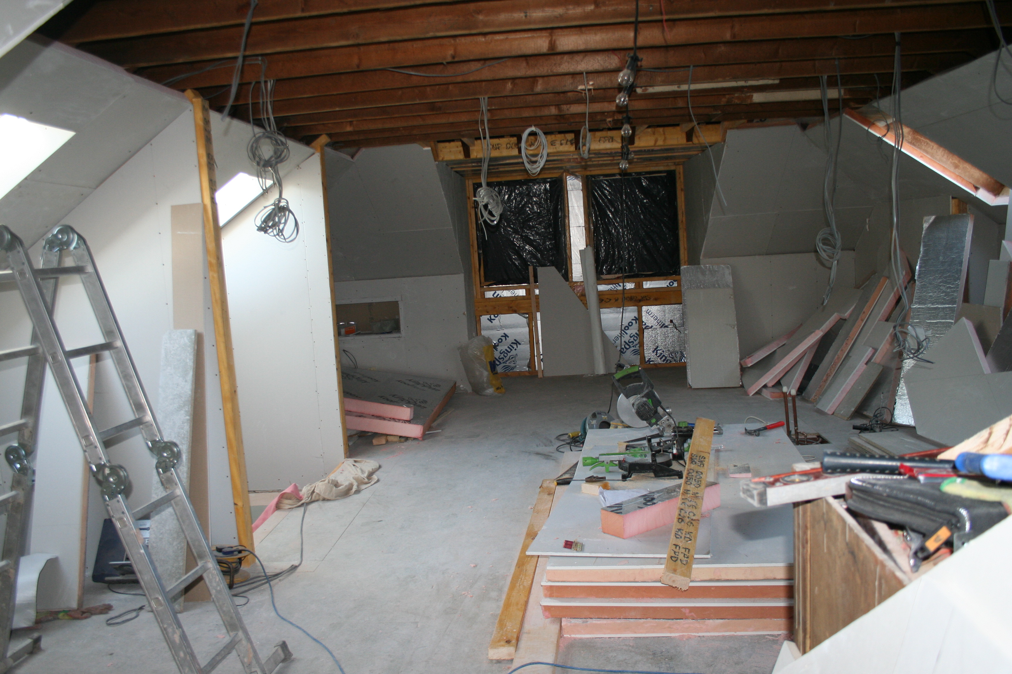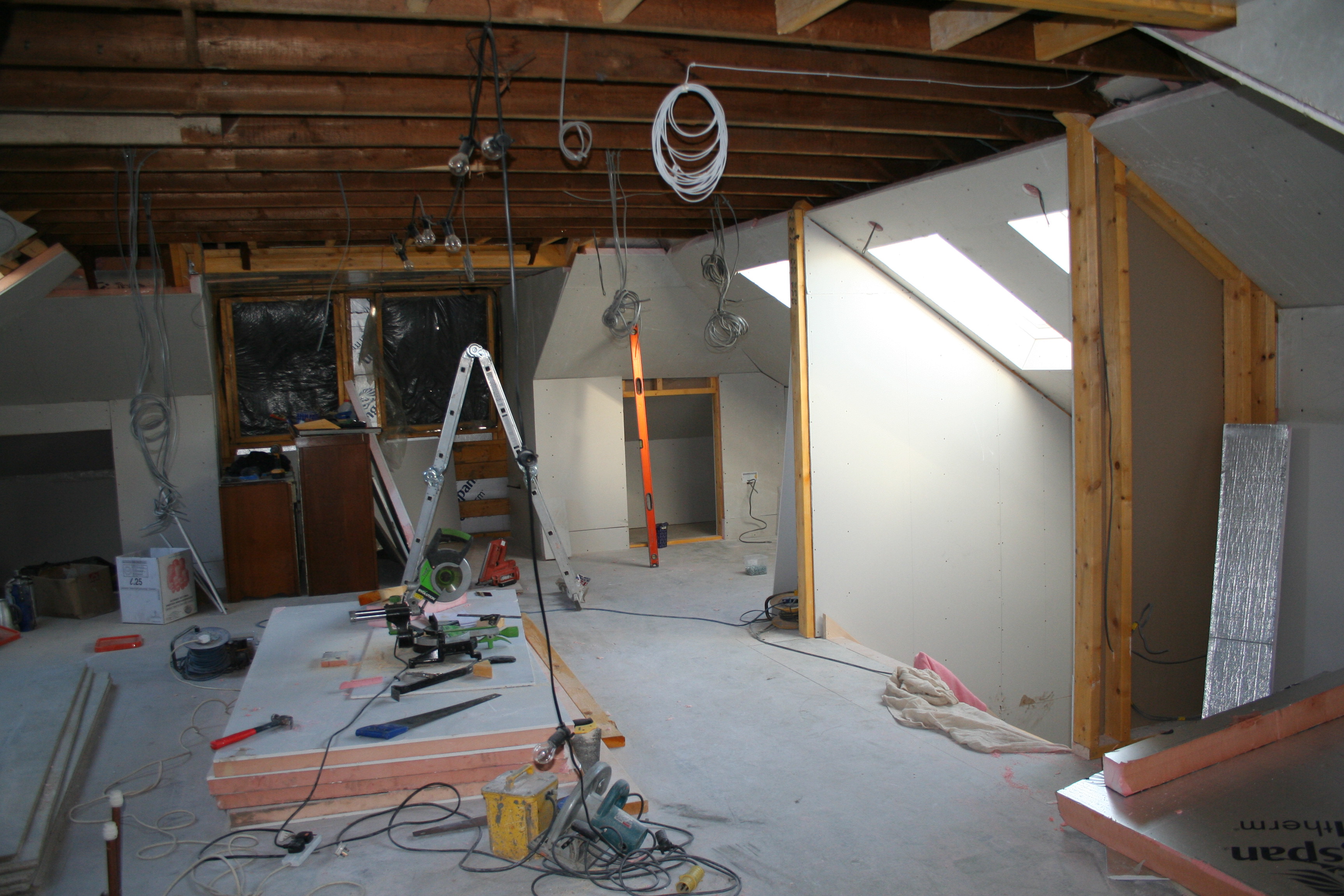 Two pictures from upstairs today, one from the front, the other from the back. The whole perimeter is plasterboarded now and the ceiling (or walls, depending on who you ask) is next.
