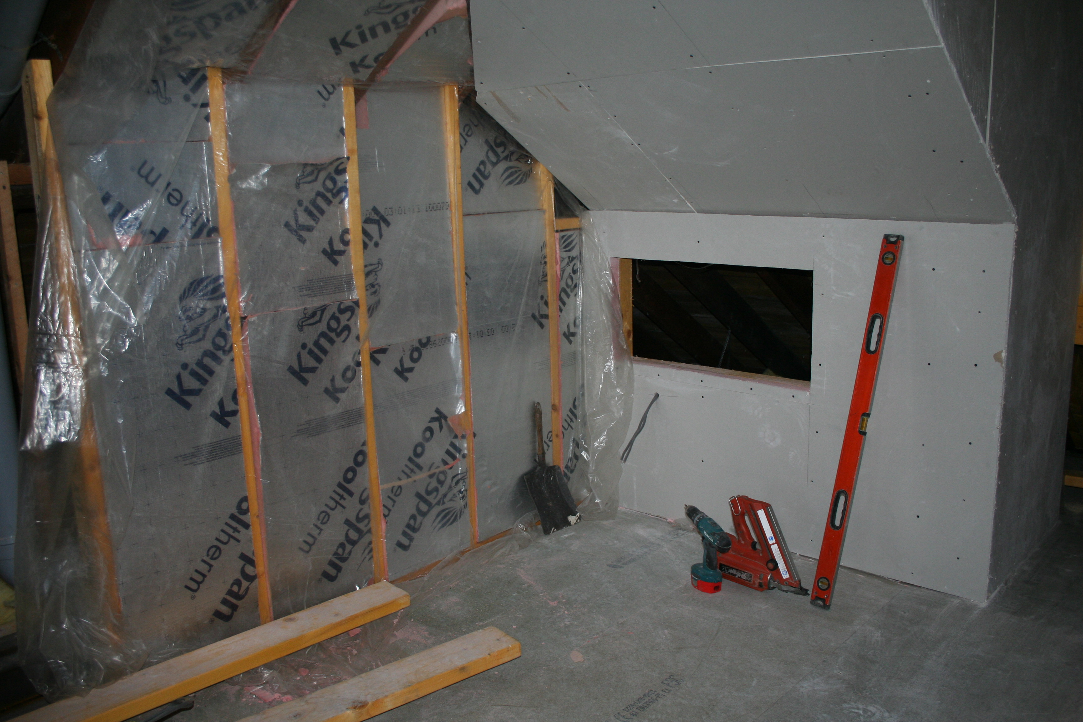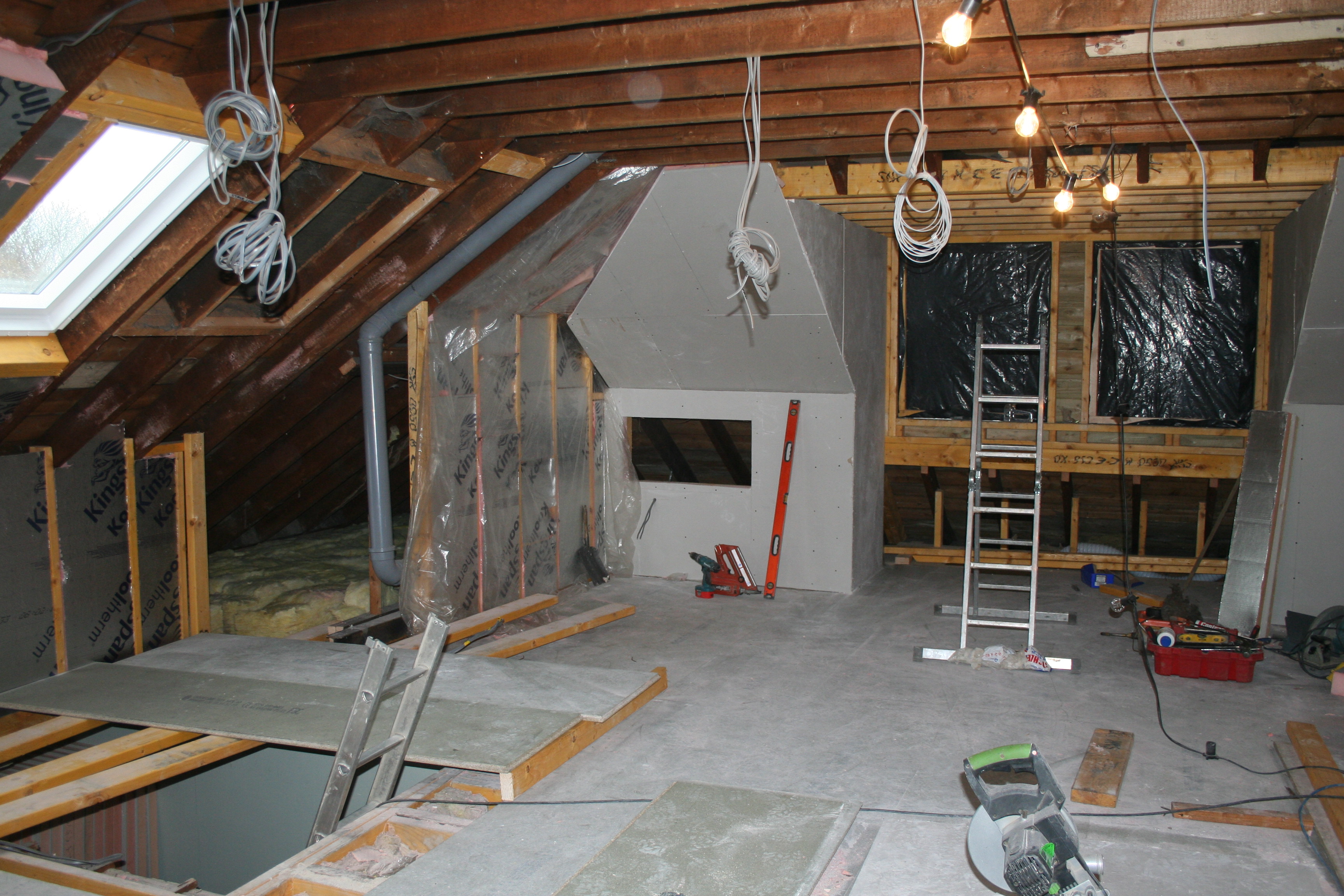 The space for the bed at the back is free of insulation now and we have measured it again. Looks like it’s plenty wide enough – hooray – panic over. The hole you can see will be a bookshelf inset into the wall which will be handy and give that wee bit extra feeling of space next to the bed. Nearly all the perimeter has been insulated now and the stairs should be here quite soon. The windows are ordered and a wee bonus that I’ll show you another time. The extra Velux is here too and works on the new bathroom have resumed. I love a bath but I am missing having a shower, especially on work days. Tiles and flooring are being researched at the moment and I even glanced at wallpaper and paint the other day.